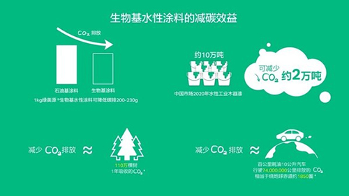据计算,运用1公斤绿美源®生物基水性涂料,与石油基水性涂料比较,可削减200-230克碳排放。以2020年的家具市场规模预算,我国水性工业木器漆为10万吨(1),假如悉数选用生物基水性涂料可全体下降碳排放2万吨,相当于约110万棵树1年时刻吸收的CO2(2),或约等于一辆百公里耗油10公升的轿车行进7,400万公里的碳排放量(3),减碳作用不容小觑。